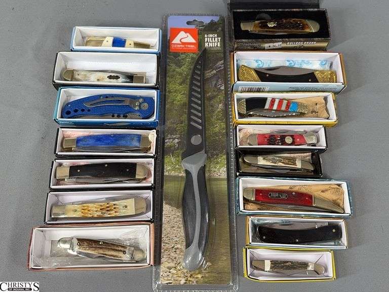 LOT 220 - 15 Pocket Knives in Boxes and 1 Ozark 6-Inch Fillet Knife New in Package. Pocket Knife Brands Include Frost, Bulldog Brand, Barefoot Cutlery, Cherokee Stone Works and Miller Bros. Cutlery