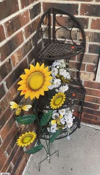 LOT 160 - Outdoor Metal Corner Stand, Metal Floral Garden Decor, Artificial Arrangements - 12" x 12" x 45" of stand