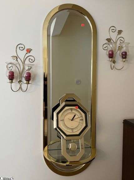 LOT 138 - Brass Tone Display Wall Mirror, Wall Candle Sconces, and Heirloom Wall Clock - 17" x 52" of wall mirror