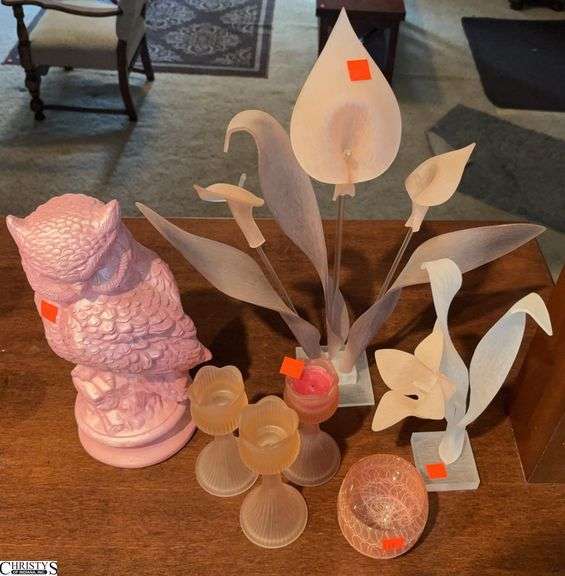 LOT 113 - MCM Kitsch Decor Grouping - Acrylic Flowers, Ceramic Owl, Pink Frosted Glass - 17" of tallest