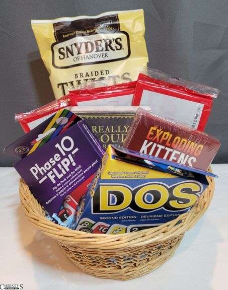 LOT 173 - Card Game Basket: Dos, Really Loud Librarians, Phase 10 Flip!, Exploding Kittens, Pretzels, & Popcorn