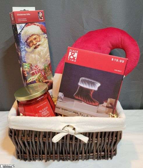 LOT 172 - Santa Basket: Santa Diamond Dotz, Sleigh Candle, Stocking Light, Hat Plush