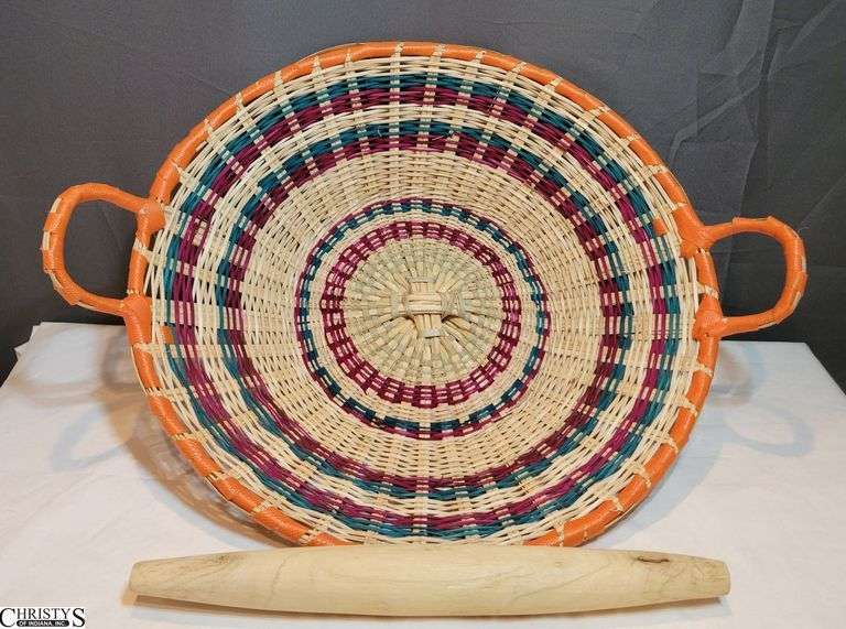 LOT 156 - Kenyan 20" Round Woven Basket with Wooden Hand Carved Rolling Pin
