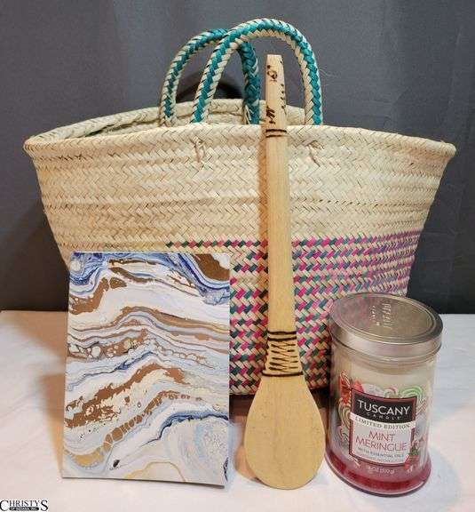 LOT 154 - Kenyan Hand Woven Basket (Purple), Kenyan Wooden Hand Carved Spoon, Candle, & Notebook