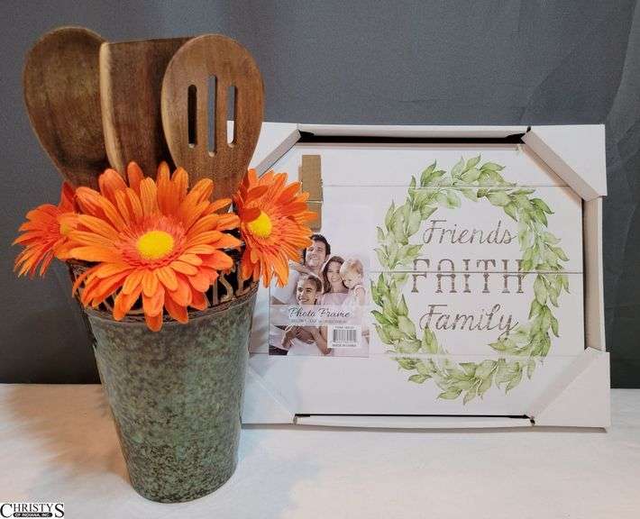 LOT 150 - God Keeps His Promises Utensil Holder with 3 Wooden Utensils and Friends Faith Family Frame