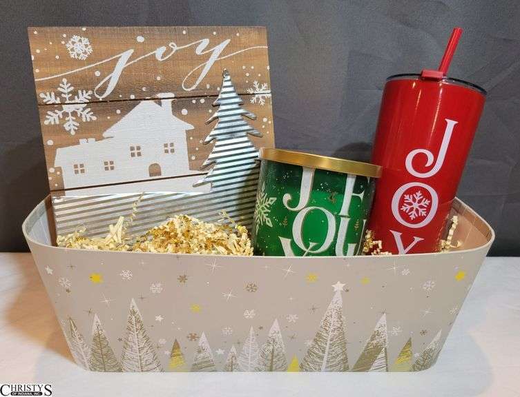 LOT 121 - Joy Basket: Wooden Block, Candle, and Tumbler