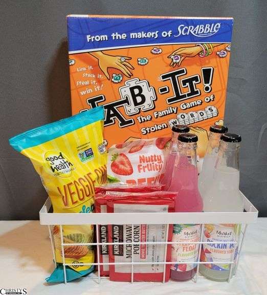 LOT 115 - Game Basket: Nab-It, Fruity Snack, Veggie Chips, 4 Popcorns, 4 Drinks
