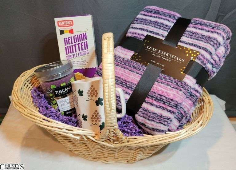 LOT 111 - Wicker Basket w/ Plush Throw, Grapevine Mug, Vineyard Retreat Candle, & Belgian Butter Waffle Crisps