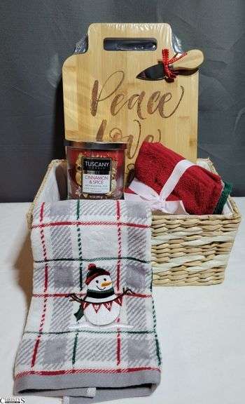 LOT 103 - Peace, Love, & Joy Cheese Board, Cinnamon & Spice Candle, Snowman Towel, Pack of 3 Washcloths