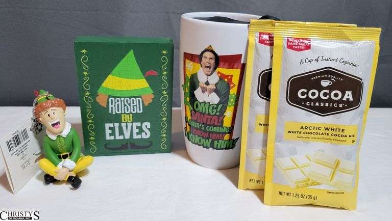 LOT 104 - Elf Ornament, Raised by Elves Block, Mug with Lid and Cocoa