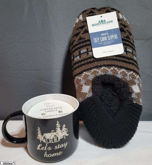 LOT 100 - Men's Cozy Slippers Size 8-12.5 with Candle Mug