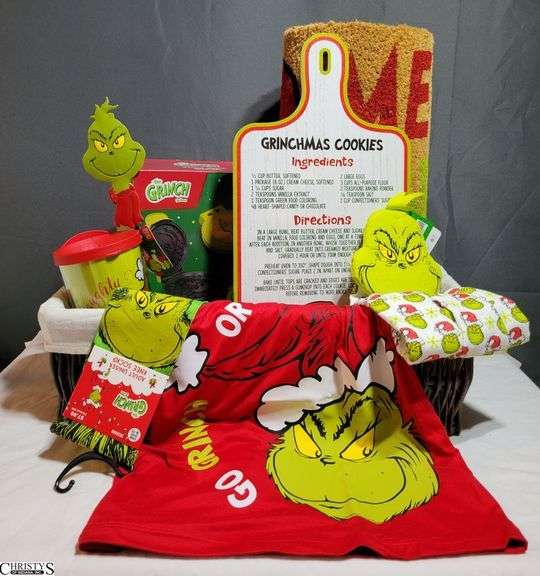LOT 94 - Large Grinch Basket: Women's S PJ Shirt, Adult Socks, Tumbler, Plant Stake, Mini Waffle Maker, Recipe Board, Doormat, Handtowel