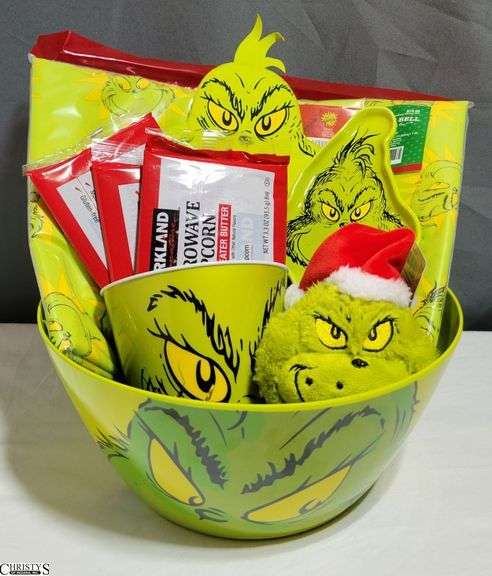 LOT 93 - Grinch Bowl, Mini Plush, Large Cup, Popcorn, Handtowel, and Tablecloth