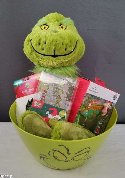 LOT 86 - Grinch Bowl, Plush, Lights, Mini Ornaments, and Scrubby Towel