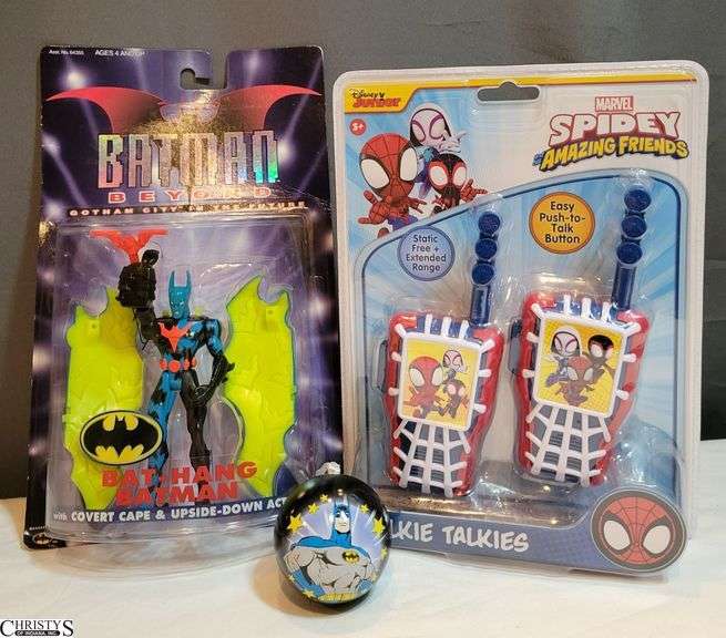 LOT 64 - Superhero Set: Bathang Batman, Spidey Walkie Talkies, and Batman Ornament