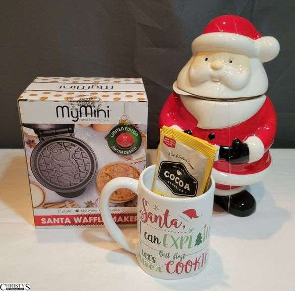 LOT 50 - Santa Mini Waffle Maker, Santa Cookie Jar, and Santa Mug with Cocoa